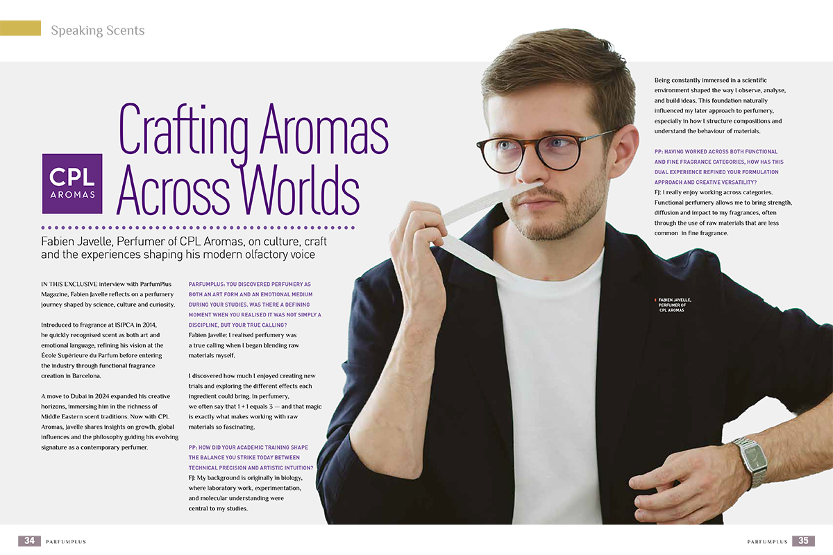 A move to Dubai in 2024 expanded his creative horizons, immersing him in the richness of Middle Eastern scent traditions. Now with CPL Aromas, Javelle shares insights on growth, global influences and the philosophy guiding his evolving signature as a contemporary perfumer.