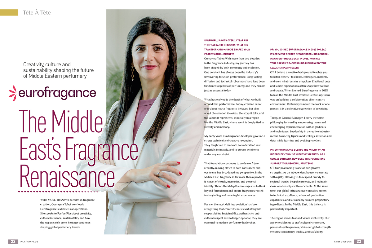 With more than two decades in fragrance creation, Oumayma Tabet now leads Eurofragance’s Middle East operations. She speaks to ParfumPlus about creativity, cultural influence, sustainability and how the region’s rich scent heritage continues shaping global perfumery trends.