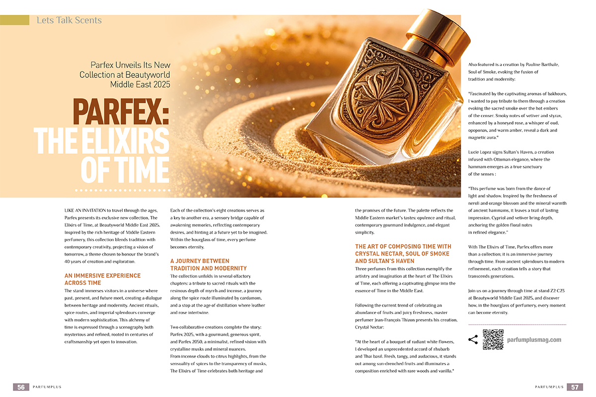 Like an invitation to travel through the ages, Parfex presents its exclusive new collection, The Elixirs of Time, at Beautyworld Middle East 2025. Inspired by the rich heritage of Middle Eastern perfumery, this collection blends tradition with contemporary creativity, projecting a vision of tomorrow, a theme chosen to honour the brand’s 40 years of creation and exploration.